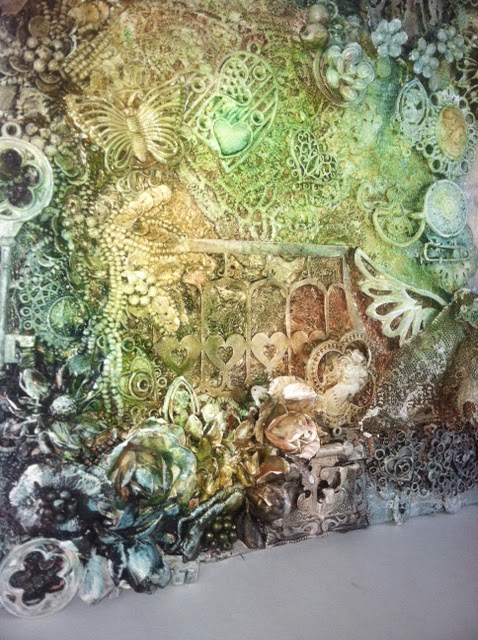 Como ven yo use muchos elementos para crear este arte en lona y muchos son cosas que ella le encantan como los Cameos y Flores. Ella no le gusta las flores en sus ropas pero si le encantaba tener un jardin de flores. Estas flores como ven son de la tienda de Creating With Details. Yo solo utilize Gesso y Lindy's Stamp Gang Sprays para alterar los colores de las flores y los elementos que use para adornar.